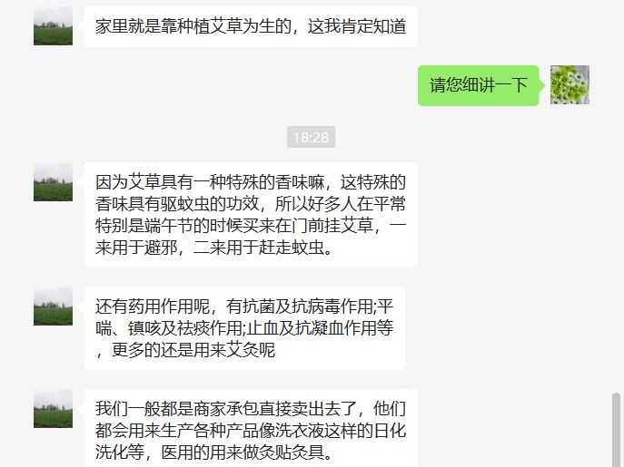通过“云走访”活动,实践团成员们对艾草的种植历史、作用功效、种植经验、种植环境以及艾草的销售渠道等相关知识有了深入了解。据悉,当地依托艾草种植产业大力发展壮大村集体经济,为当地人的就业和生活提供了极大的帮助。实践团成员们也将尽最大的努力去促进建立艾草全产业链体系,进一步延长艾草产业链,提升艾草附加值,以科技力量助力乡村振兴。