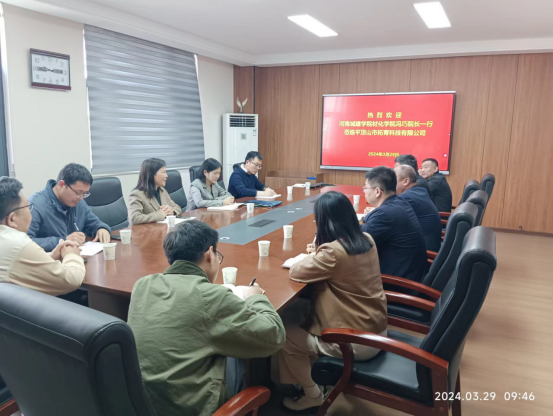 2024年3月29日上午,我公司博士服务团一行5人,在冯巧经理的带领下,与平顶山市高新区科技创新局副局长马骏、临港物流产业园区副主任姜朝凯等相关领导一起,前往平顶山市拓青科技有限公司走访调研。公司负责人刘国良接见并组织了座谈和现场参观。