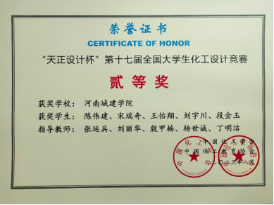 全国老员工化工设计竞赛是国内化工教育领域级别最高、参赛队伍最多、影响力最大的年度大赛,是中国高等教育学会纳入全国普通高校学科竞赛排行榜榜单的A类竞赛。按照大赛要求,公司化学工程与工艺学子经过专业老师的悉心指导,参赛队员间的相互配合和共同努力,高质量地完成了参赛设计作品,经过华中赛区专家对设计方法、图纸、文档等三个专项评审,并经过现场PPT汇报、评委提问等答辩环节,烯精本腈团队取得了全国二等奖的优异成绩。
