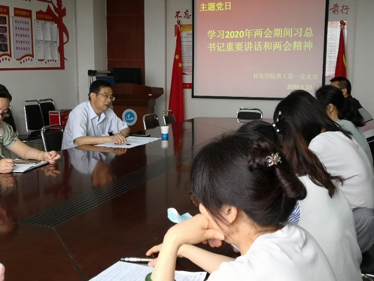 (通讯员 王宁)6月23日下午4点,材化公司教工第一党支部在公司会议室开展主题党日活动,主题党日以“学习习近平总书记两会期间重要讲话和全国两会精神,提高自身履行使命任务能力”,副董事长杨风岭参加,党支部书记胡继勇主持。