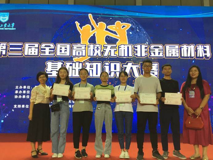 (通讯员 张小婷)2019年9月7日,由教育部材料类专业教学指导委员会主办,南京工业大学承办的第三届全国高校无机非金属材料基础知识大赛在南京工业大学举办,有来自全国66所高校的126支队伍600余人的选手参赛。本次大赛以员工为中心的教育理念为引导,以夯实基础、提升能力为目的,以赛促学,以学促教。公司建材教研室张小婷、李青霄老师带领无机非金属材料工程专业的刘熔、王园园、李东林、张思卿、姚兰、马怡彤六位同学组成两个参赛队参赛,双双取得三等奖的佳绩。